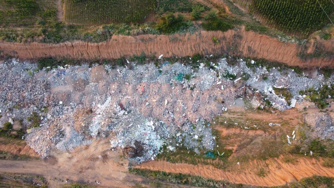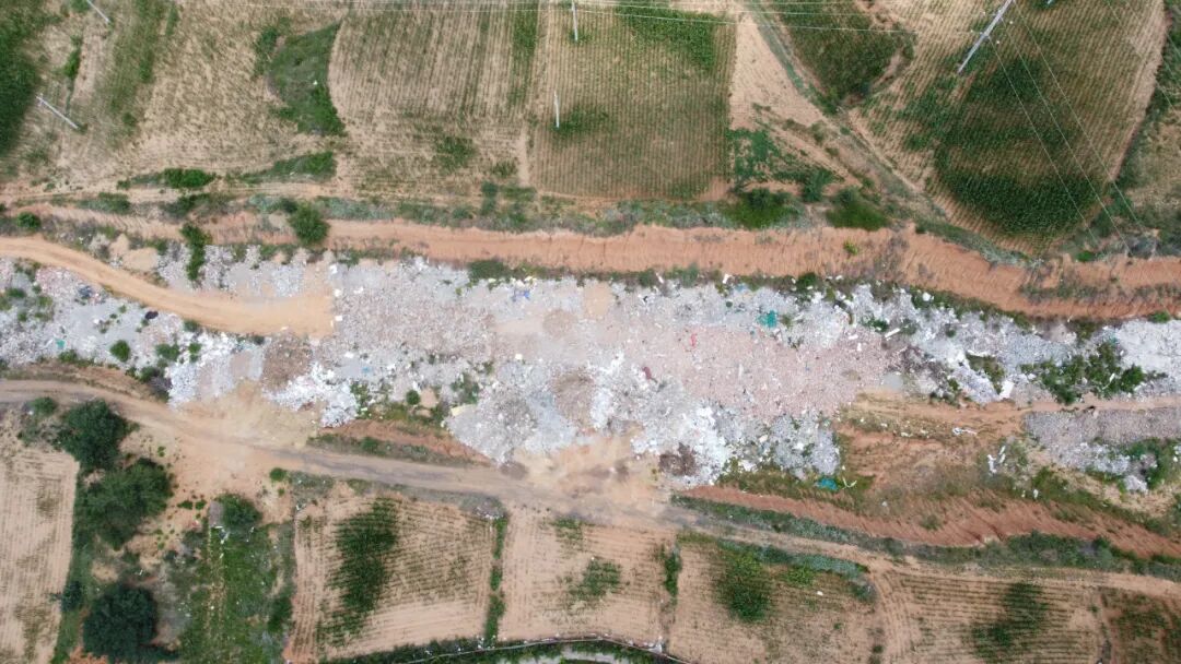 山沟两侧堆放建筑垃圾:废砖废石、废弃电缆、废弃钢筋、废弃塑料板、废弃遮盖用绿网……有的散乱堆放,有的则用编织袋装着;中间则堆放着10余米高,未被分类处理的生活垃圾。垃圾场紧邻二广高速,从航拍画面看,垃圾场像是玉米地里一条裂开的“伤疤”。