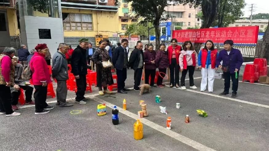 东乡街道湖山社区举行老年运动会,通过设置象棋、扳手腕和套圈等多项趣味活动,吸引近百名老年居民踊跃参与。