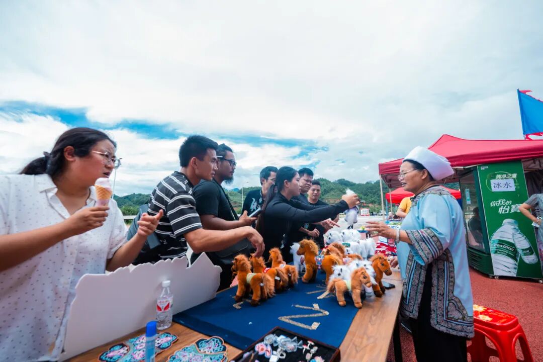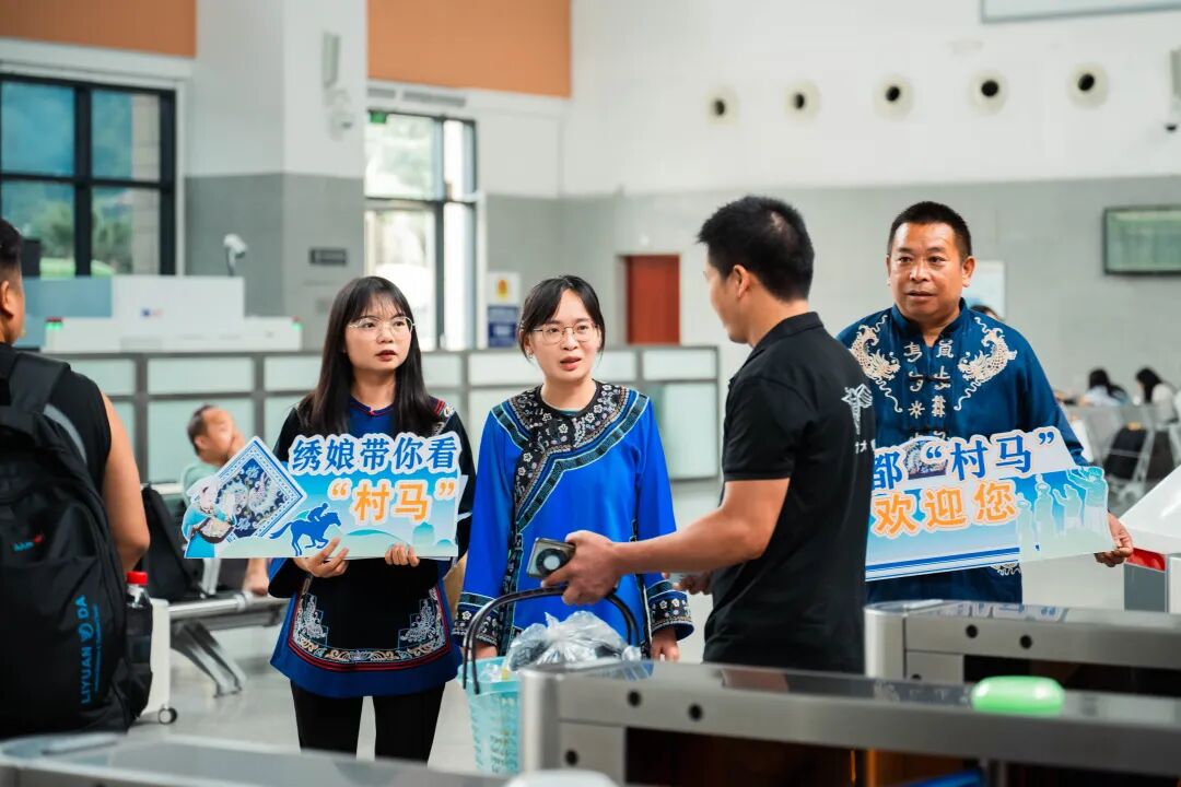 ▲绣娘代表到高铁站接游客免费去往“村马”现场。