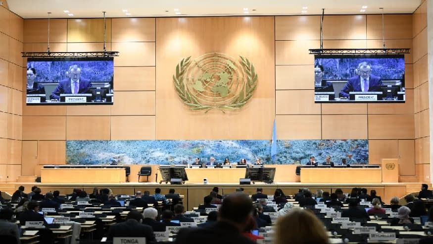 这是11月7日在瑞士日内瓦万国宫拍摄的联合国人权理事会普遍定期审议工作组第五十届会议现场。新华社记者连漪摄