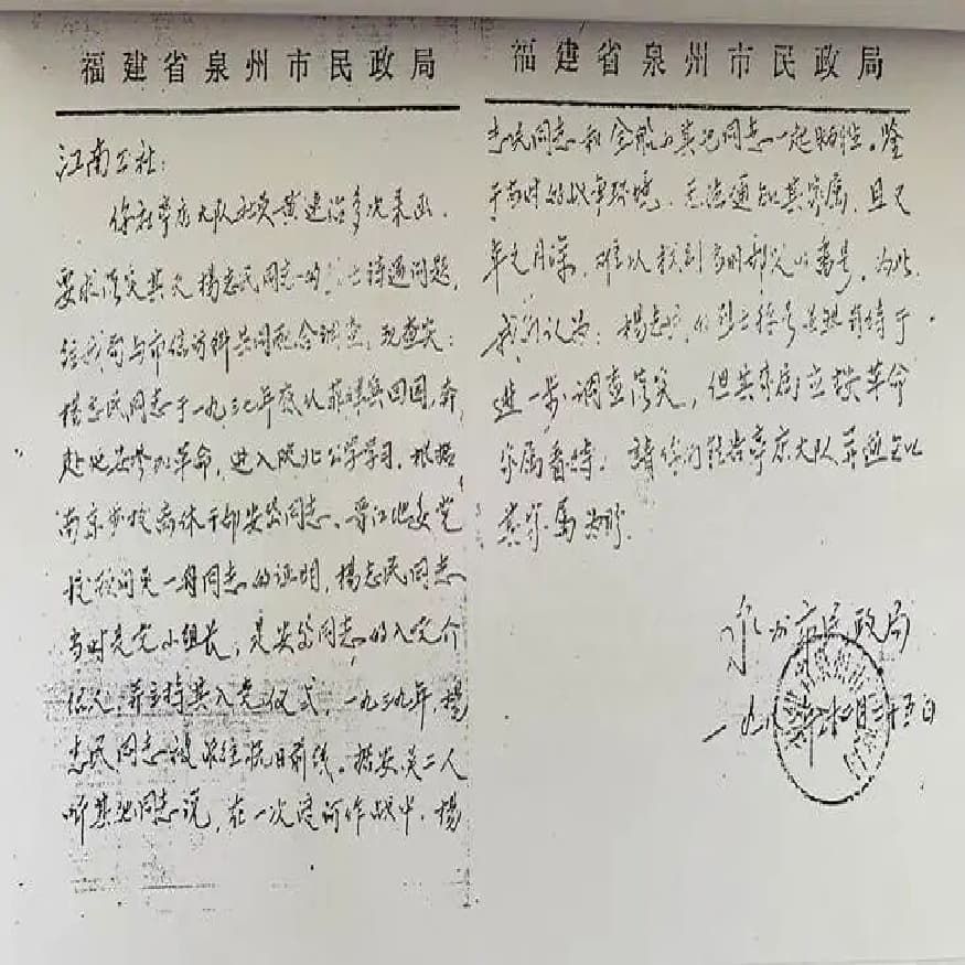 寻找的步伐从未停歇。杨棋龙决心替母亲完成未竟遗愿,他通过购买书籍资料、查阅革命前辈回忆录、向革命前辈发出求助信等方式,想方设法寻找这个未曾谋面、也很少听母亲提及的父亲的革命足迹。工夫不负有心人,他在泉州地方史料、革命名人回忆录等资料里发现了不少提及杨志民的语句,可惜也都是只言片语。幸好,施纯亮先生在1970年代末曾写过一篇长文《火样的革命热情 青松似的革命性格——记杨志民同志》,全文回忆了他和志民先生在延安学习、训练和生活的诸多细节,成为迄今为止有关志民同志革命事迹、政治思想和为人处事的最详细、最生动的记录资料。可是,认定烈士所需要的刚性证据——部队番号档案和牺牲战役及时间地点,仍如大海捞针毫无进展。