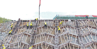 走进达州普光经开区物流产业园铁路专用线项目的施工现场,只见整个场平已初具雏形,挖土机、推土机等大型机械正轰鸣运转,各类运输车辆来回穿梭,工人们正在进行人字格框架护坡混凝土浇筑、线间沟基坑开挖以及钢筋绑扎等作业,现场一派繁忙景象。