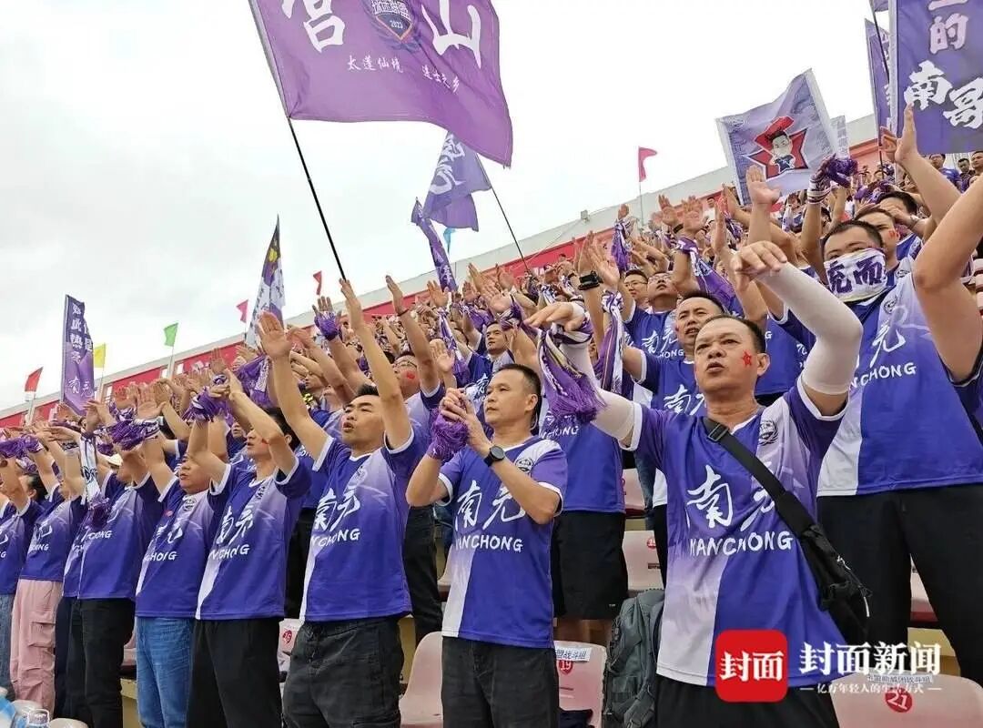 著名南充籍歌唱家陈小涛激情演绎南充队队歌《南哥 冲冲冲》,以高亢嘹亮的嗓音唱响“千年绸都千里江,养出南哥好儿郎”。全场观众齐声跟唱,声浪如潮。当陈小涛将话筒转向看台时,“南哥,冲冲冲”的呐喊如山呼海啸,无数围巾在看台上汇成紫色波浪——这正是南充队的主色调。这场持续30分钟的文艺盛宴,既是对“川超”联赛的隆重献礼,更是南充这座千年绸都向全省球迷展开的文化长卷。