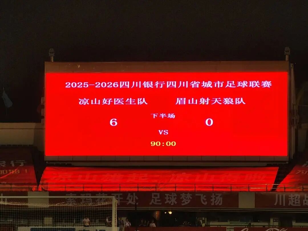 10月2日晚,2025/2026四川银行四川省城市足球联赛,凉山好医生队主场对阵眉山射天狼队。经过激烈角逐,凉山好医生队6:0眉山射天狼队,拿下来之不易的3分。