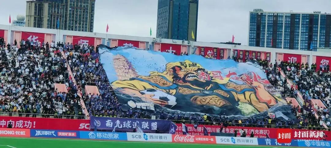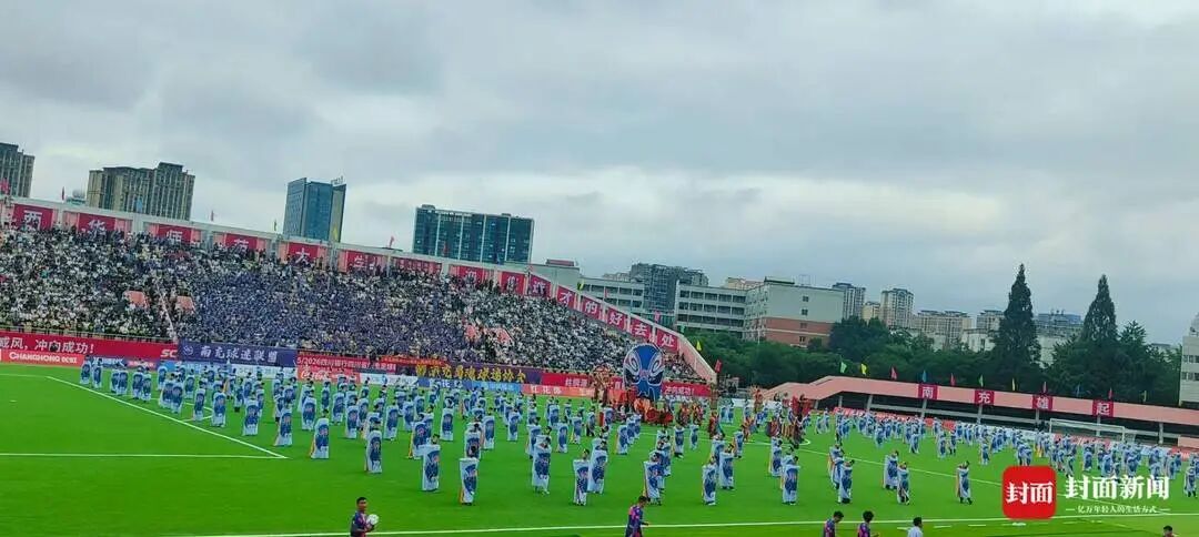 下午2时30分,一场融合南充特色的文艺演出率先点燃全场气氛。川北大木偶率先登场,两米多高的木偶身着华服,在艺人操控下拂袖回眸,袍袖翻飞间演绎着千年绸都的传奇。紧接着,金色巨龙腾空而起,南充非遗舞龙队以“游龙穿云”之势在绿茵场上翻腾跃动,龙身起伏间金光闪耀。川剧绝活惊艳四座,脸谱艺人振臂转身,青面獠牙瞬间化作红脸忠勇,引得看台惊呼连连。随后的吐火表演更是将气氛推向高潮——演员们深吸一口气,猛然吐出熊熊烈焰,引发球迷阵阵喝彩。憨态可掬的“大熊猫”木偶摇摆登场,抱着竹筒在场上滚绣球、翻跟头,萌态百出的互动让小朋友们手舞足蹈。