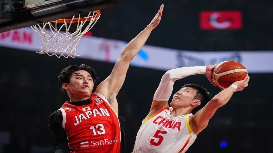 2月26日,中国队球员余嘉豪(左)在比赛中投篮。新华社记者 贾浩成 摄