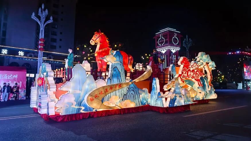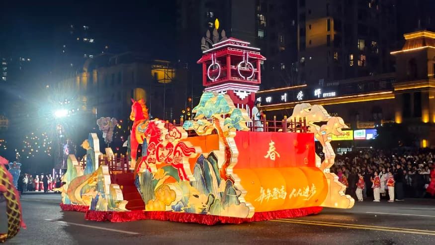 当十米长的巨型花车缓缓驶入视野,现场瞬间沸腾。花车上骏马昂首、凤凰楼高耸,流光溢彩尽显巴渠气魄,车身上的“年年登高、人人进步”字样,道出了这座城市的精神内核。
