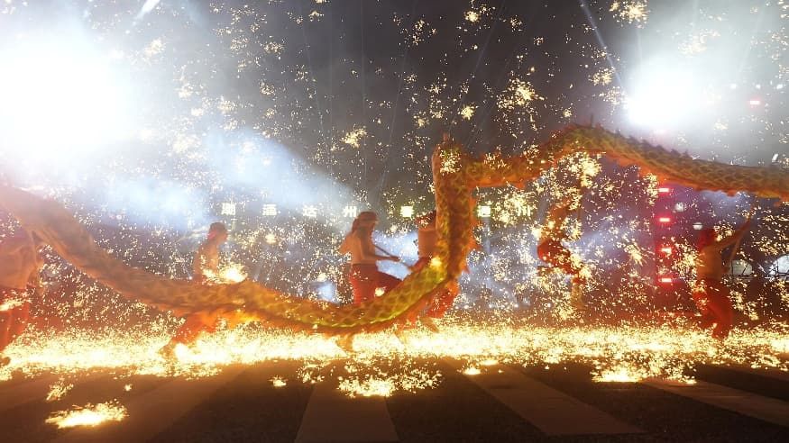 当晚的重头戏在压轴时分震撼登场——舞火龙、打铁花、火壶表演点燃了现场人群的激情。当1600℃的高温铁水击向高空,刹那间铁水炸裂成漫天金雨,如星河倾泻、金菊怒放,在夜空中绘就“火树银花不夜天”的壮美画卷。与此同时,火龙表演震撼登场。赤膊的舞龙人穿行于漫天铁水金花间,长龙昂首腾跃、辗转盘绕,气势如虹,承载着人们对新年风调雨顺、五谷丰登的美好期许。
