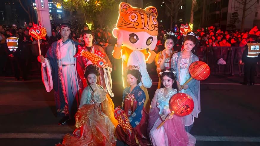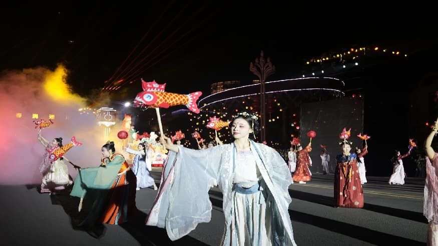 据(达州融媒记者 | 程序)消息:火树银花不夜天,非遗民俗闹新春。昨晚,达城金龙大道莲花湖巴山大剧院沿线人潮涌动,一场以“潮涌达州 春满通川”为主题的元九登高大型非遗民俗巡演在此上演。