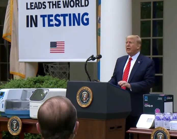 在记者会上,特朗普的两侧高挂“美国在检测端领先世界”的巨幅海报,他宣布,美国在人均检测数量上已超越了韩国、英国、法国、瑞典等许多国家,所以“不管你怎样看,美国在检测端都是领先世界的。”