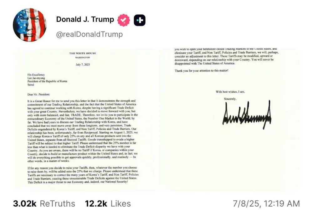 特朗普警告称,如果日韩两国以提高关税作为回应,美国也将在25%的基础上再提高同等额度的关税。