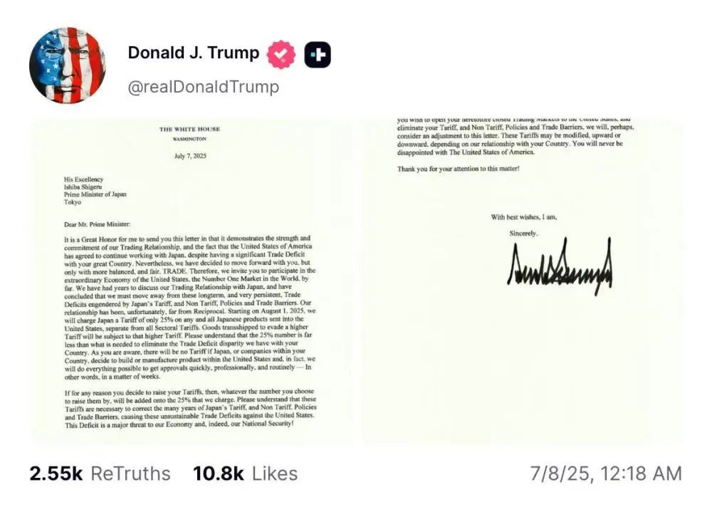 特朗普7日早些时候在自己创立的“真实社交”网站上发布他写给日本首相石破茂和韩国总统李在明的信,表示新关税将不包括其他行业关税。