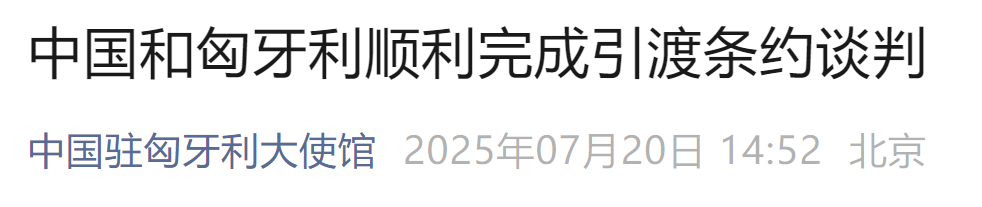 2025年7月14日至16日,中国和匈牙利引渡条约谈判在布达佩斯举行。