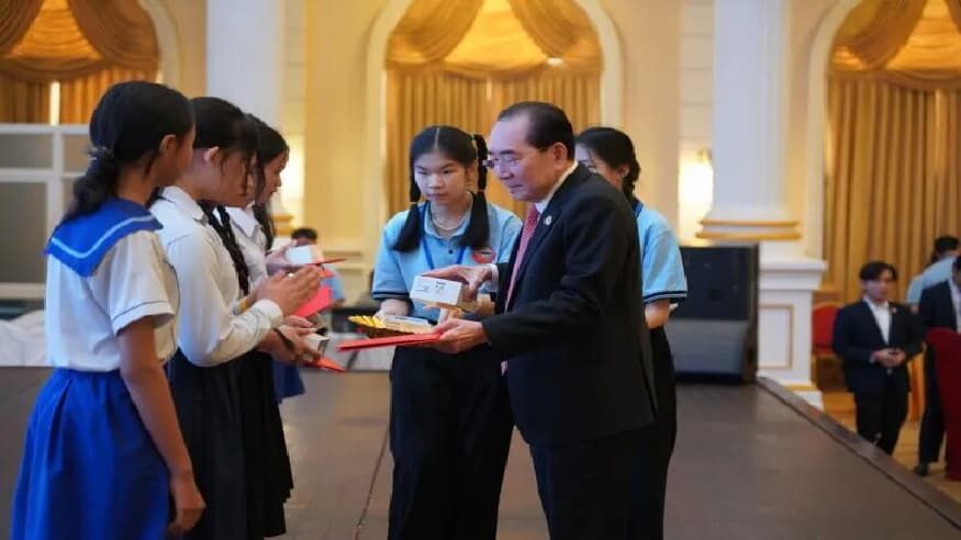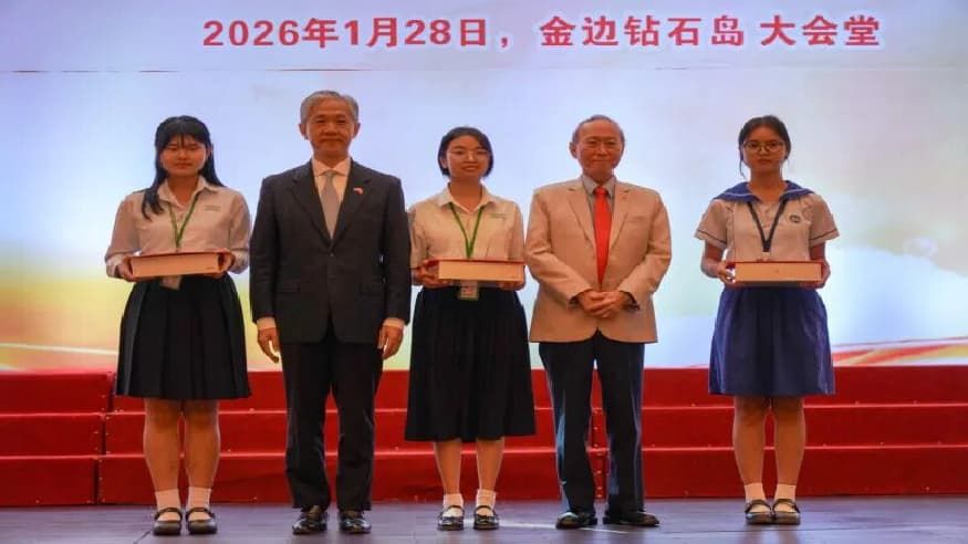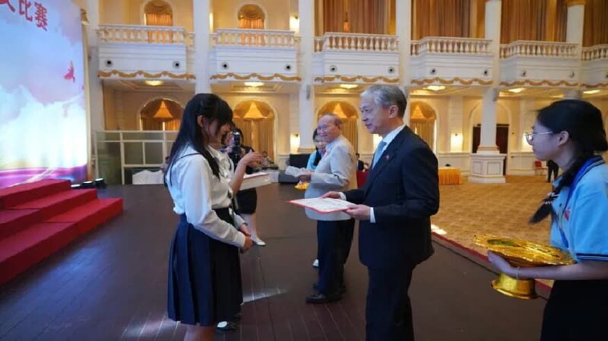 据【伟成 柬华日报消息】本月28日上午,由中国驻柬大使馆与柬华理事总会联合主办的2025年全柬华校学生“大使奖”现场作文比赛颁奖仪式,在金边钻石岛大会堂隆重举行。