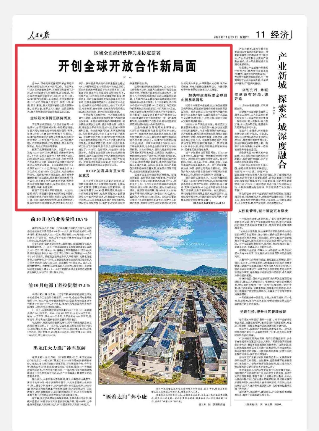 24日,商务部党组书记、部长钟山在《人民日报》撰文表示,这标志着,世界上人口最多、经贸规模最大、最具发展潜力的自由贸易区正式启航。 以下是这篇文章的部分内容 1. 全球最大自贸区顺势而生 凝聚了成员国意愿共识 东盟于2012年发起RCEP谈判,8年来,各成员国举行了4次领导人会议、23次部长级会议、31轮正式谈判,共同推动全球最大自由贸易区从构想变为现实。 此次签署协定的15个成员国总人口22.7亿,国内生产总值合计26.2万亿美元、总出口额5.2万亿美元,均占全球的约30%。 构建了区域高水平经贸规则 RCEP以全面、现代、高质量和普惠的自贸协定为目标,对标国际高水平自贸规则,形成了区域内更加开放、自由、透明的经贸规则,涵盖货物贸易、服务贸易和投资领域等,协定文本长达1.4万多页。 货物贸易零关税产品数量整体上超过90%,大幅降低区域内贸易成本和商品价格。 服务贸易开放承诺涵盖了大多数服务部门,显著高于目前各方与东盟现有自贸协定水平。 投资方面,15方均采用负面清单对制造业、农林渔业、采矿业等领域投资作出较高水平开放承诺。 各方还就中小企业、经济技术合作等作出规定,纳入了知识产权、电子商务、竞争政策、政府采购等现代化议题,适应知识经济、数字经济发展的需要。 中方发挥了积极作用 在货物贸易方面,RCEP的优惠关税涵盖我与其他成员每年超过1.4万亿美元的进出口贸易。 在服务贸易方面,我对120多个服务部门作出了开放承诺。 我国首次在经贸谈判中达成投资负面清单,首次在国际协定中纳入数据流动相关规定,首次在自贸协定全面纳入知识产权保护。 2. RCEP签署具有重大深远意义 这是中国对外开放的里程碑 RCEP签署后,我已与26个国家和地区签署19个自贸协定,与自贸伙伴的贸易额占比由此前的27%扩大到35%左右,与现有自贸伙伴的双向开放水平也得到提升,充分彰显了我国坚定不移扩大开放的决心。 这是构建新发展格局的重要平台 2019年,我国与其他成员国贸易总额约占我外贸总额的1/3,来自其他成员国的投资额占我外资总额10%以上。 RCEP将增强国际国内两个市场、两种资源的联通性,促进国内国际双循环,推动加快构建新发展格局。 这是多边主义和自由贸易的胜利 RCEP全体成员国共同承诺降低关税、开放市场、减少壁垒,坚定支持经济全球化。 据国际智库测算,到2030年,RCEP有望每年带动成员国出口净增加5190亿美元,国民收入净增加1860亿美元。 3. 加快构建高标准全球自由贸易区网络 推动RCEP尽快生效实施 继续坚定支持东盟中心地位,与各成员一道,加快完成国内协定批准程序。 与各方协调做好关税减让、原产地标准等方面的具体执行安排,让协定早日惠及各国企业和人民。 与各成员共同努力,在用好协定制度性优惠政策基础上,更好发挥RCEP平台作用,深化和拓展各领域务实合作。 进一步拓展自由贸易区网络 推动中国—柬埔寨自贸协定尽快生效。 推进中日韩、中国—海合会、中国—挪威、中国—以色列等自贸协定谈判进程。 进一步升级与东盟、新加坡、韩国、新西兰等现有自贸协定。 持续扩大自贸伙伴“朋友圈”。 提升自贸区建设水平 RCEP大量吸收了国际上其他自贸协定的经验,在海关程序和贸易便利化、知识产权保护、贸易救济、电子商务等广泛领域,达到了较高标准。 继续面向国际上更多的主要经济体、主要区域贸易安排,积极开展对话与沟通,不断提高我自贸协定的“含金量”。
