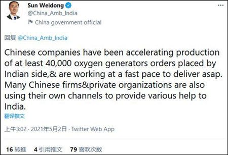 中国目前已经向印度提供了大量制氧机。北京时间5月2日凌晨,中国驻印度大使孙卫东在推特上发表推文,介绍了中国向印度提供抗疫援助的情况。