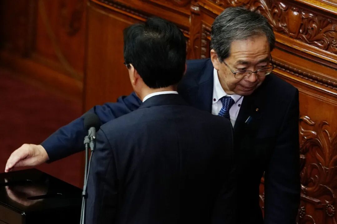 10月21日,在日本东京,公明党党首齐藤铁夫(右)参加临时国会众议院首相指名选举投票。新华社记者 贾浩成 摄