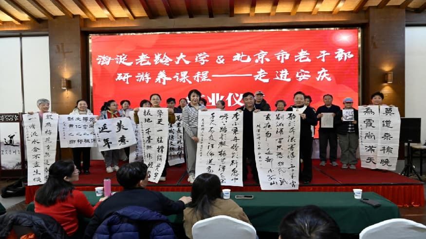 11 月 19 日下午,《走进安庆,北京老干部 & 海淀老龄大学研游养旅居课程》结营仪式在天悦湾温情启幕。安庆市委老干部局副局长、市老年大学副校长 华文江,安庆市委老干部局办公室主任、四级调研员 周艳北京市民政局原一级巡视员 陈建领,北京市人大常委会委员、城建环保委副主任 赵迅、全联康旅团队及安庆在地服务伙伴代表与全体学员齐聚一堂,共同见证这段美好旅程的圆满收官。