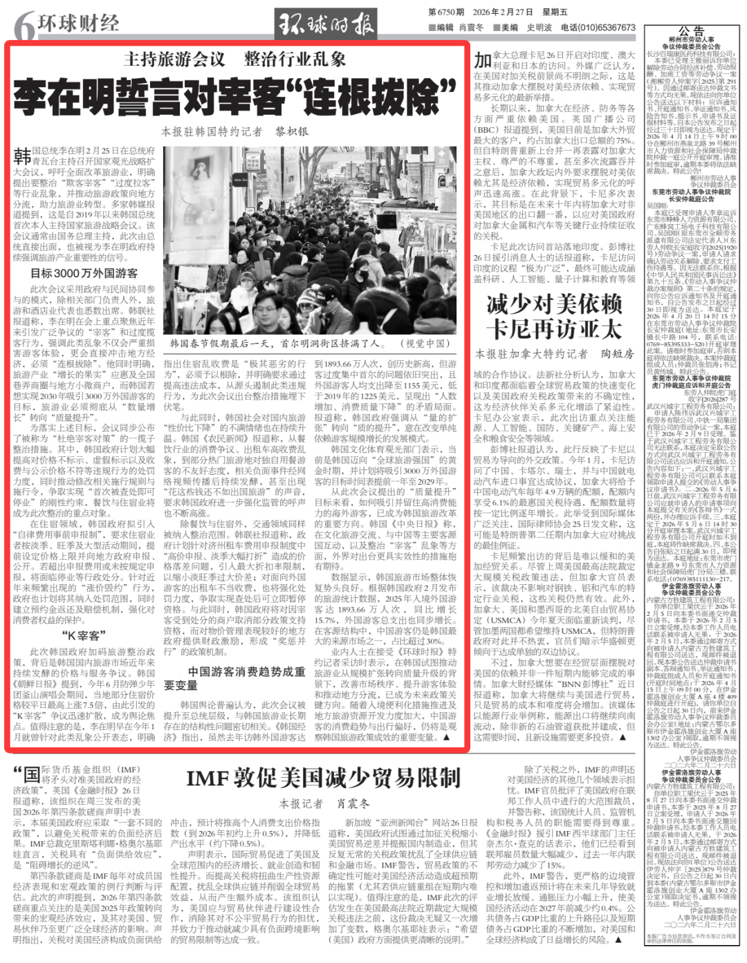 韩国总统李在明2月25日在总统府青瓦台主持召开国家观光战略扩大会议,呼吁全面改革旅游业,明确提出要整治“欺客宰客”“过度拉客”等行业乱象,并推动旅游政策向地方分流,助力旅游业转型。多家韩媒报道提到,这是自2019年以来韩国总统首次本人主持国家旅游战略会议。该会议通常由国务总理主持,此次由总统直接出面,也被视为李在明政府持续强调旅游产业重要性的信号。
